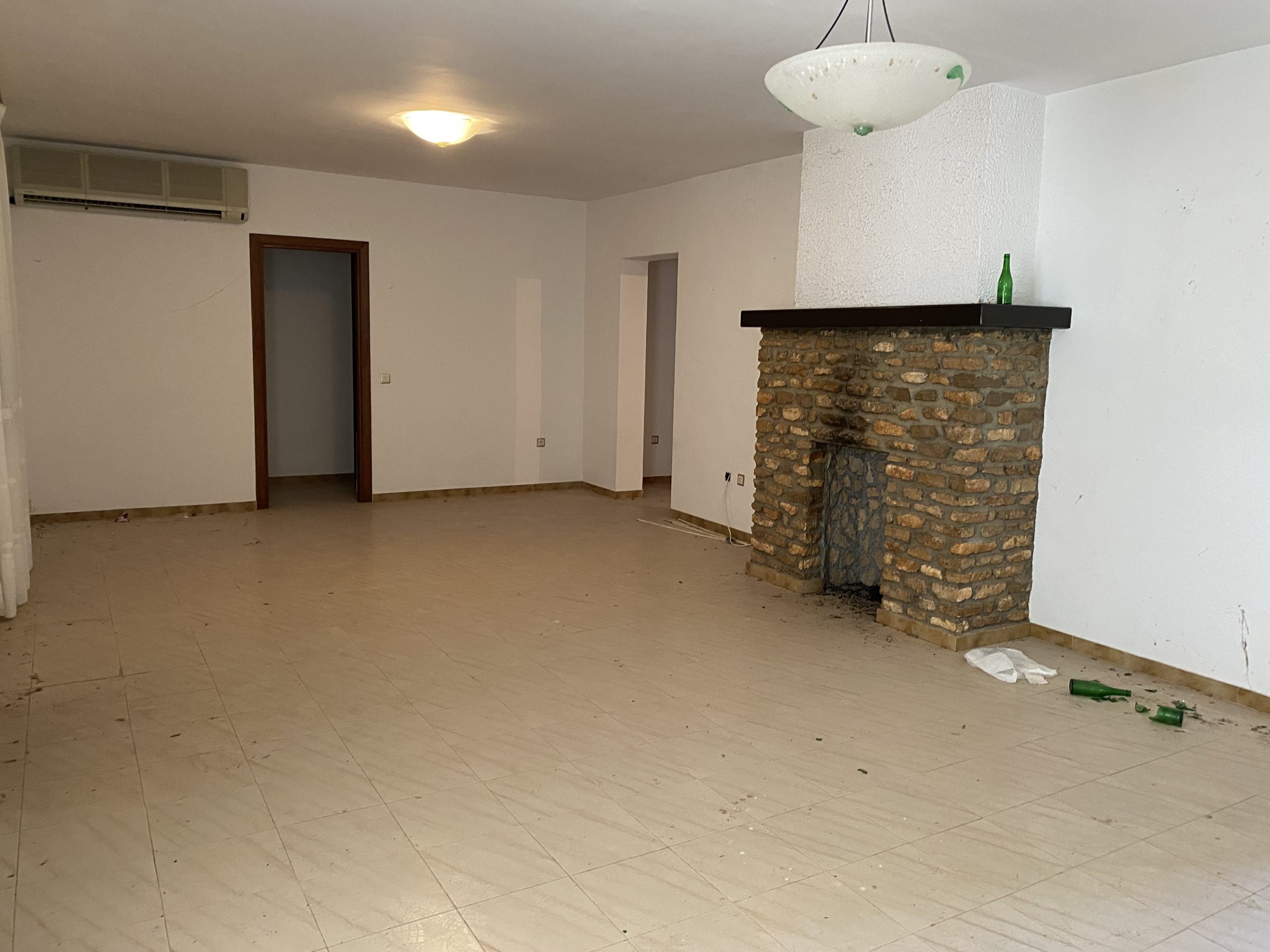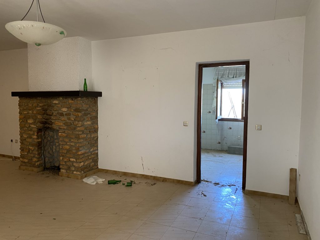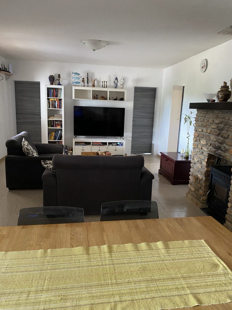 De woonkamer hebben wij in twee delen gesplitst. Het is lange kamer met een open haard/kachel tegen het lange muur. De linkerkant hebben wij de tv en bankstel staan. De rechterkant is de grote eetkamer met koffie bar.